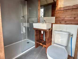 Il intègre une douche, un WC et un lavabo, complétés par un coin cuisine équipé comprenant évier inox, plan de travail, plaque de cuisson et espace dédié au réfrigérateur.
